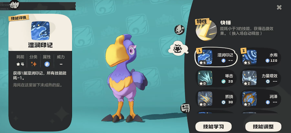 锤头鹳:它的辅助能力还是非常强的,被动技能【快捷】可迅速释放低能耗技能,独家技能“湿润印记”能让全队技能消耗降低,使队伍能量不断,瞬间进入爆发状态。