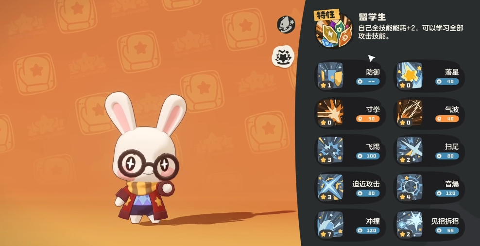 技能搭配是发挥学院呱呱潜力的核心。基础技能组包括标准的物理单体伤害技能“落星”、能在造成伤害的同时为自己回复1点能量的关键续航技能“寸拳”、提供属性互补伤害的魔法攻击“气波”,以及能减免70%所受伤害的保命必备“防御技”。围绕这些基础技能,玩家可以发展出两条主要进阶路线。物理输出流以“寸拳”为核心,配合“落星”补充伤害,并利用技能石学习如“岩石爆”或“火焰踢”等物理技能来增强压制力,“寸拳”的能量回复是支撑这套打法高频输出的关键。魔法爆发流则必选核心技能“魔能爆”,它能将“留学生”被动增加的2点能耗转化为额外的伤害加成,完美抵消了副作用;再搭配“气波”进行属性打击,以及“倾泻”技能来驱散对手的增益印记,有效干扰敌方节奏。