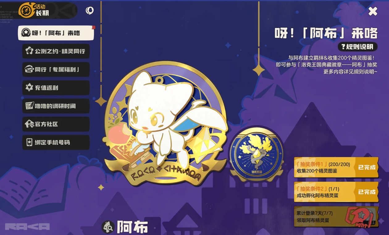洛克王国世界阿布徽章并非常规玩法可获取的道具,其独特性源于内测专属的获取机制。这枚徽章仅能通过游戏早期测试阶段的“精灵同行”活动获得,内测期间完成指定任务后,系统会自动发放至账号,且可随角色数据继承至公测版本,成为识别内测玩家身份的珍贵标识。