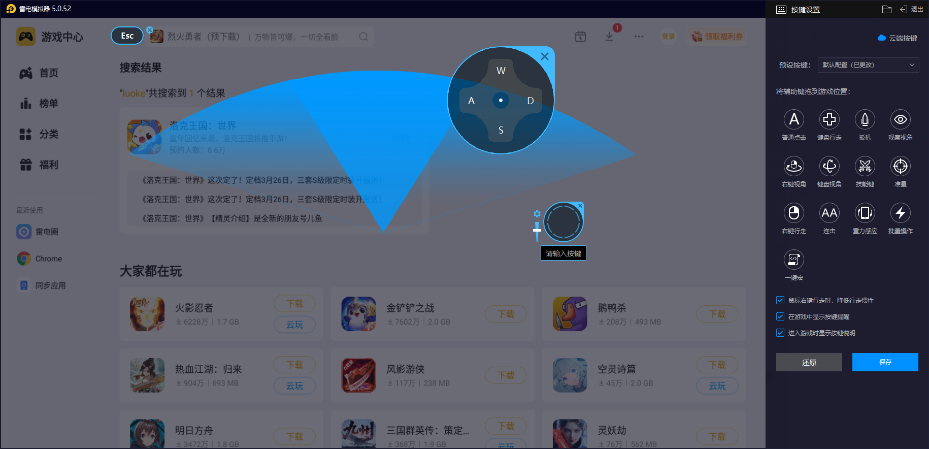 雷电模拟器是支持键盘映射的,可以让玩家主动把精灵技能快捷键设置为鼠标或键盘组合键,比如我们常见的WASD移动+数字键释放技能等就是其中之一,这样就能让自己去进一步的实现精准战斗操作,而且宏命令录制也是很不错,能让玩家去快速的针对重复性操作来进行录制,这样就能让自己在战斗的时候,通过宏指令来做到一键触发,大幅度提升自身的手动操作便捷性。