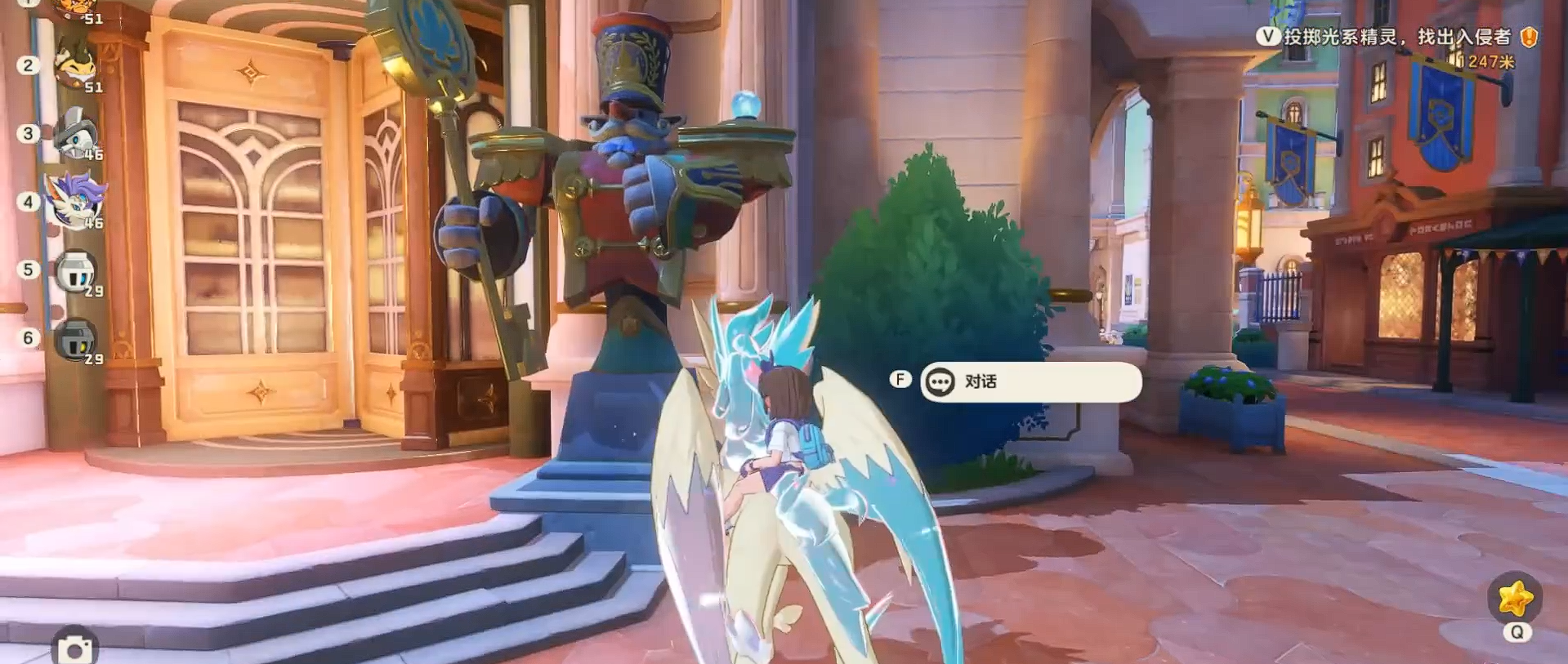 登上屋檐平台后,要收集5枚蓝色水晶球,只有集齐才能触发秘境入口。水晶球分布有固定位置:绿色房屋正前方1枚、右侧住宅屋檐边缘1枚、右手边长条座椅上1枚、广场中央基座旁1枚,最后1枚在旋转门右侧机器人模型的左肩,集齐后地面会浮现光效提示,靠近提交水晶就能开启秘境。