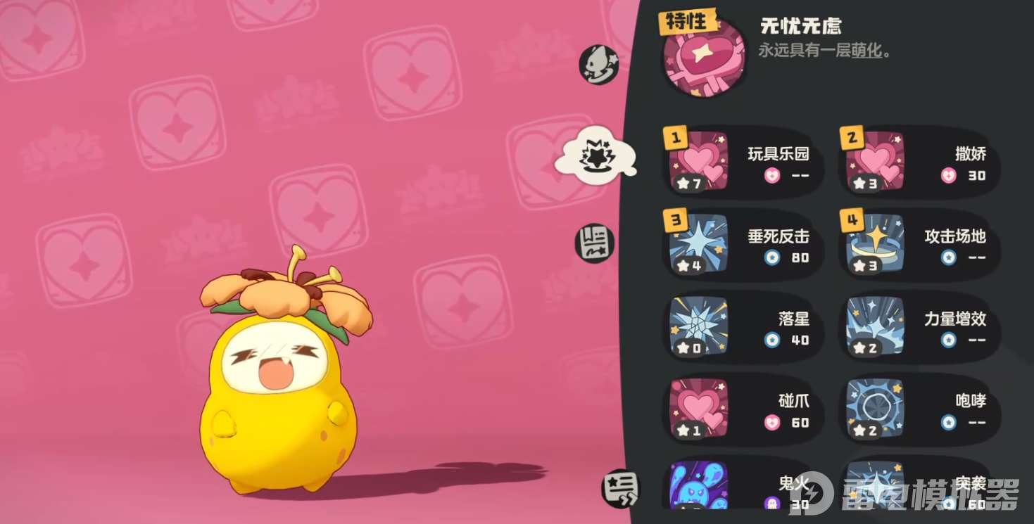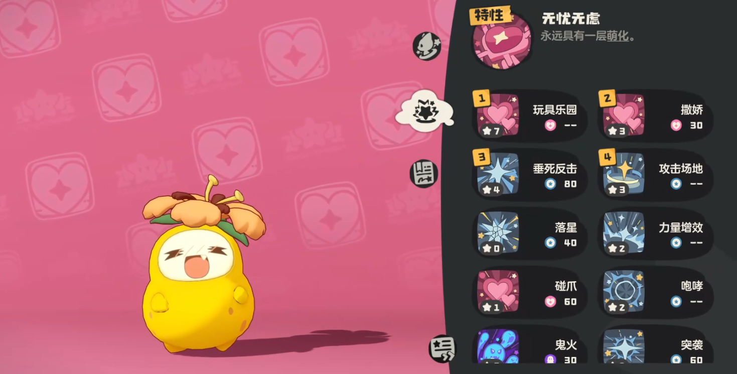 这套配招适合大部分场景,也是玩家最常用的搭配,核心围绕萌化机制展开。推荐携带撒娇、玩具乐园、逆向演化、垂死反击。撒娇是核心输出技能,萌化状态下伤害翻倍;玩具乐园能触发萌化,还能提升防御和速度;逆向演化可以转移萌化状态限制对手;垂死反击残血时伤害拉满,整套配招能打能抗,适配多数对战情况。