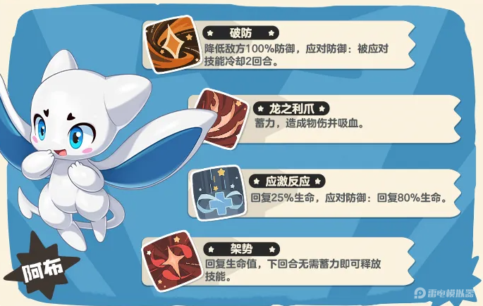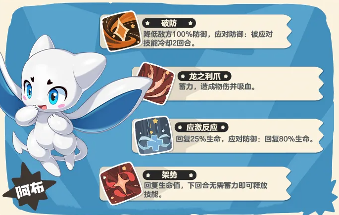 阿布是《洛克王国:世界》里兼顾输出、续航与生存的全能宠物,属性均衡,既能打日常副本开荒,也能应对玩家之间的对战。它的技能体系包含高伤攻击、生命恢复、属性增益和状态防御,配招时要贴合这个定位,才能让它在战斗里稳定发挥作用。