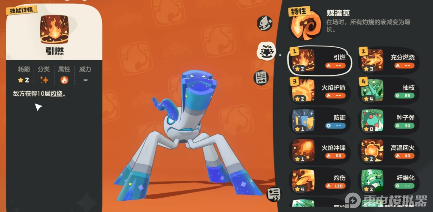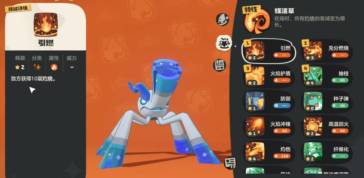 燃薪虫的主流配招思路遵循1火系技能搭配3草系技能的模式,这样的搭配能最大化触发煤渣草特性,让灼烧状态持续叠加。核心技能里,易燃物质是关键的魔攻连击技能,每次连击都能赋予敌方2层灼烧效果,在特性加持下,单次释放该技能就能叠加多层灼烧。充分燃烧技能可以将目标当前的灼烧层数翻倍,并且立刻触发一次灼烧伤害,能瞬间提升输出量;藤缚技能则能稳定造成物理伤害,同时积攒战斗能量,保障技能的持续释放。