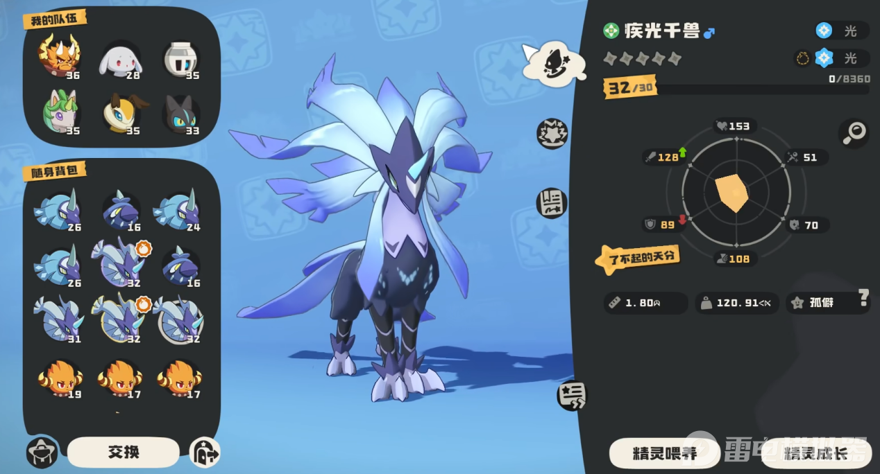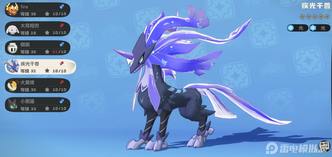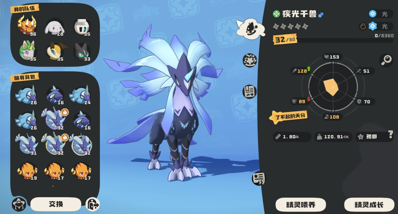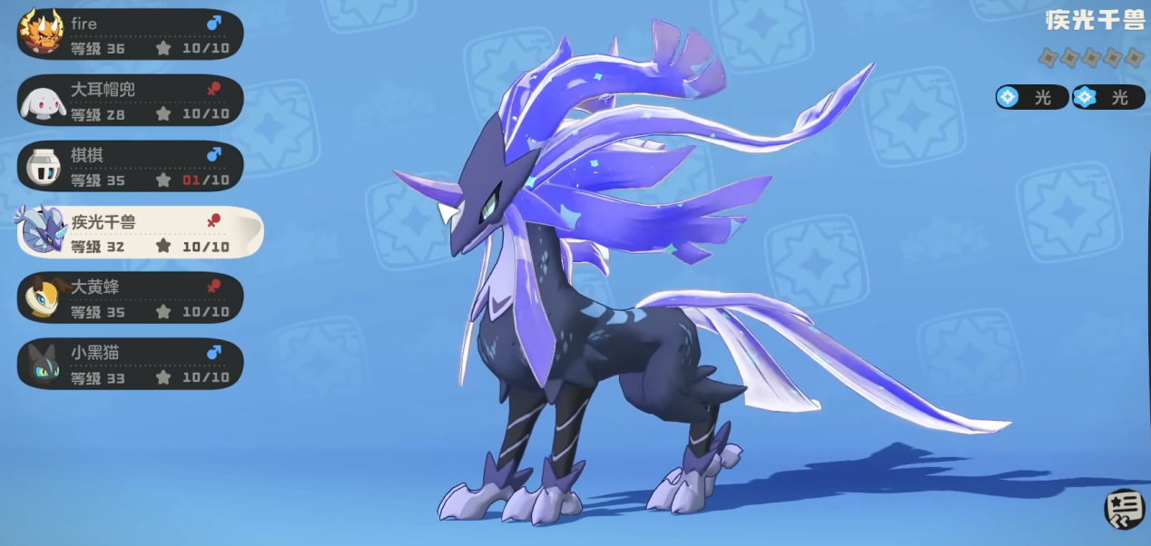 疾光千兽是光属性高速爆发精灵,定位为团队主C与残局收割者。种族值侧重速度与魔攻,自带“光脉”特性,队伍中每多一只光系队友,自身伤害提升10%,最高叠加40%。实战中靠快速叠加“星陨”标记打爆发,克制恶魔、幽灵系,适合PVE副本攻坚与PVP速攻体系。