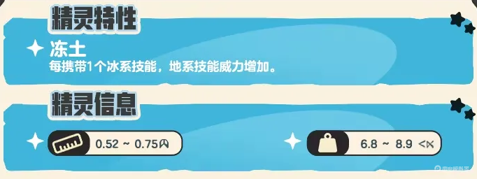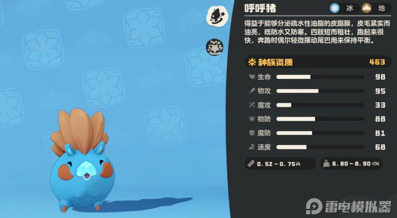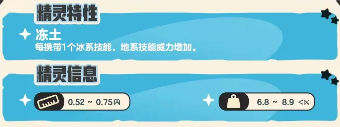 呼呼猪属于冰、地双属性的攻防一体精灵,定位是团队副坦兼范围输出。进化后血量与物攻成长突出,能在前排承伤,也能靠冰地联动打爆发。特性“冻土”是核心机制,每携带1个冰系技能,地系技能威力提升,至少带2个冰系才能最大化收益。