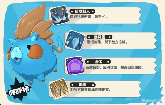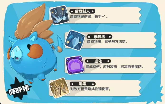 呼呼猪的核心技能各有侧重,暴风雪作为冰系核心群攻,命中可叠加敌方冻结层数,能群体压血线、打乱节奏,也是触发“冻土”特性的必带技能;地震是地系高伤大招,清理集群敌人、攻坚BOSS时表现突出,是主要输出技能;后发制人作为后手反击技能,受攻击后触发,可反弹伤害并强化物攻;虚化能让它短时间进入虚化状态,规避关键伤害、清除负面,提升生存容错,保障输出连贯。