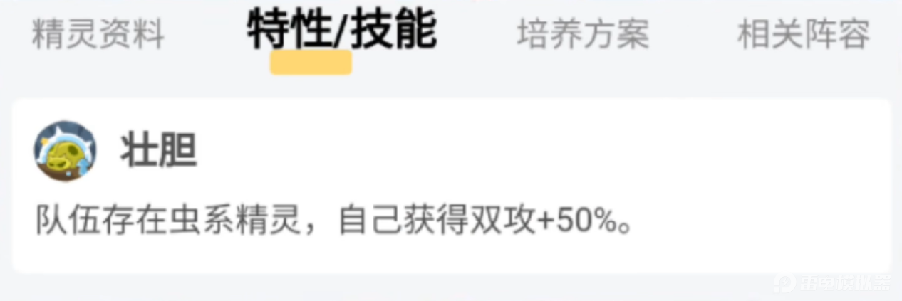 巨噬针鼹为普通系精灵,总种族值558点,核心优势集中在130点物攻与134点生命值,防御端物防88点尚可,魔防65点偏弱,速度85点属于中等水平。特性为“壮胆”,队伍中存在虫系精灵,自己获得双攻+50%,虫系阵容下伤害增益显著。