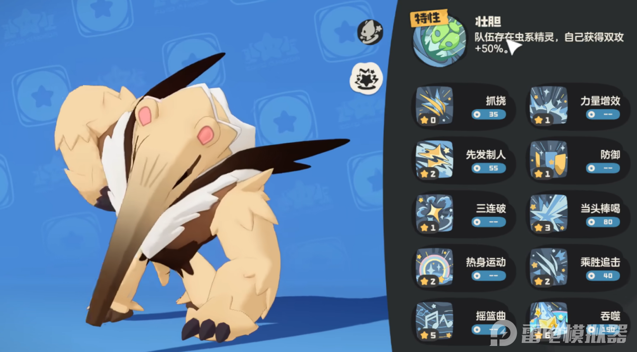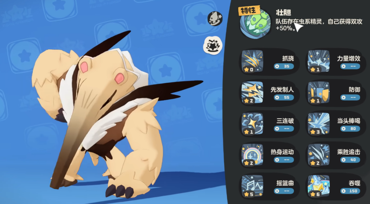 巨噬针鼹最适配虫系核心阵容,以它为核心输出,搭配2-3只虫系精灵触发“壮胆”特性。推荐阵容:巨噬针鼹+卡卡虫+芋香巨角蛛+绒光悠悠。卡卡虫先手控制减防,为巨噬针鼹创造输出环境;芋香巨角蛛负责清buff与联防,保障队伍节奏;绒光悠悠可开沙暴天气,提升地系技能效果,同时提供续航保护。