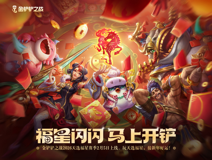 《金铲铲之战》2026天选福星赛季现已上线!🏮 年味十足的经典福星玩法焕新回归,享受满屏红包雨的爽快体验,迎接新年第一波好运!🌟祥瑞盈门,诸多免费奖励和优惠折扣正在路上,叫上你的铲搭子,共度一个福气满满、欢乐无限的马年春节!📣就在今日,福星闪闪,马上开铲!