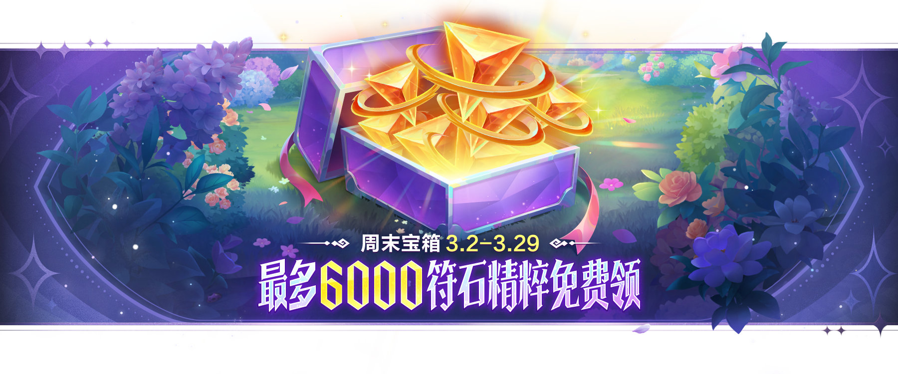 【周末宝箱】3月2日10点至3月29日23:59,每天登录都可以领取登录奖励,同时为“周末宝箱”增加100符石精粹的奖励。