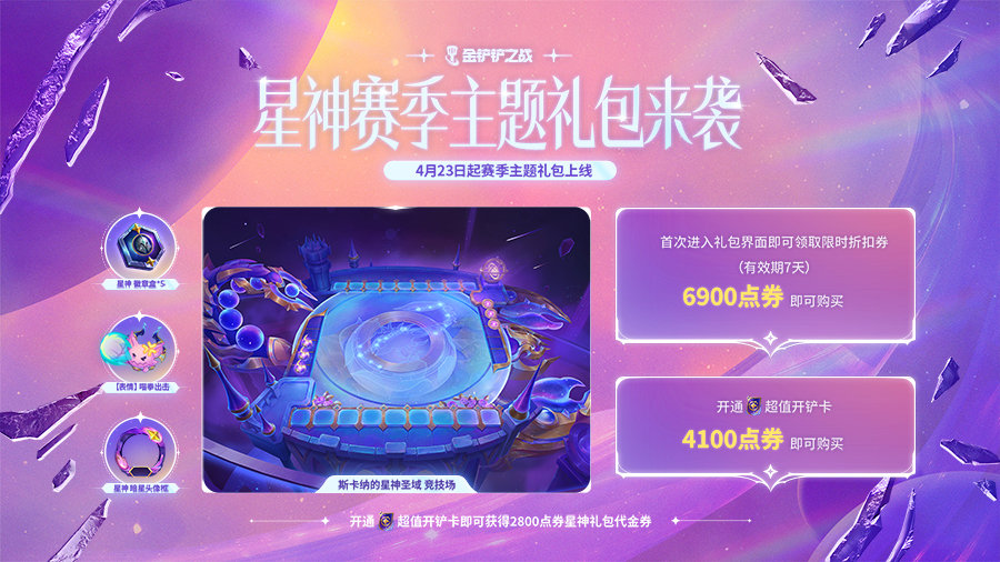 4月23日更新后,商城将上架全新“星神赛季主题礼包”。购买礼包可获得传说级竞技场【斯卡纳的星神圣域】,并附赠表情-喵拳出击、星神·暗星头像框、星神·徽章盒×5。