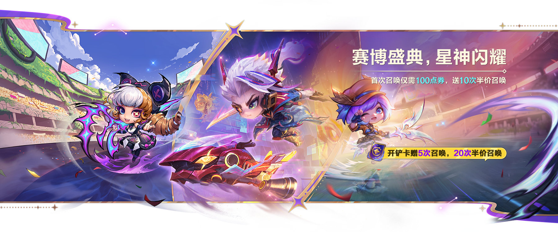 首次浏览活动即赠5枚赛博盛典星灵币,首次召唤仅需100点券,还有首次10连半价折扣。