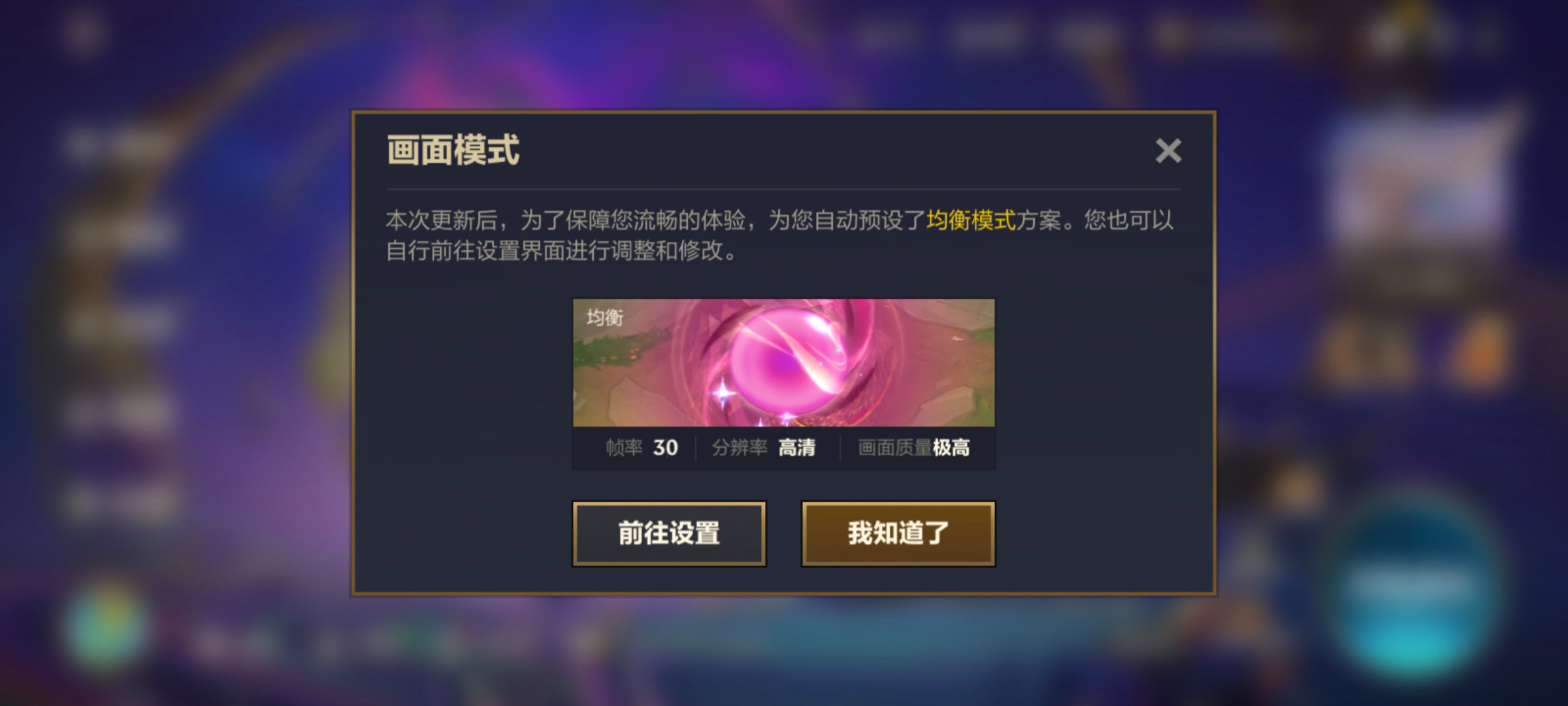● 重置【均衡】模式:版本更新后,所有弈士的画面设置将自动调整为「均衡」模式,弈士们可以点击“前往设置”进行心仪的设置。