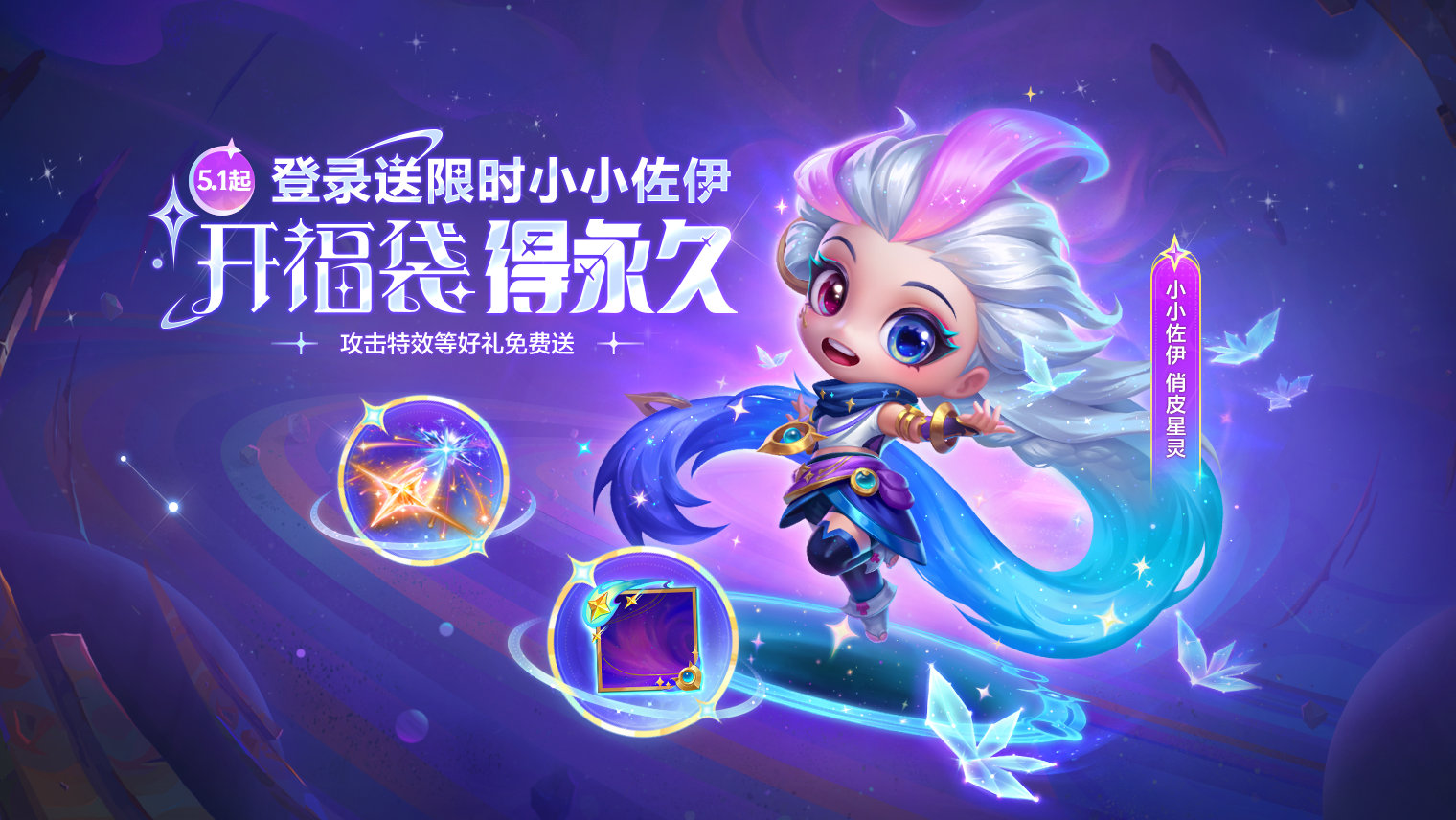第二阶段:5月1日0点起至5月24日,弈士登录游戏进入活动界面即可领取“限时·小小佐伊·俏皮星灵”,并且通过活跃行为可以获取开铲季福袋,打开福袋可以获取丰厚奖励。累计打开一定数量福袋,还可以获取永久“小小佐伊·俏皮星灵”、“星界幻梦·攻击特效”等奖励!