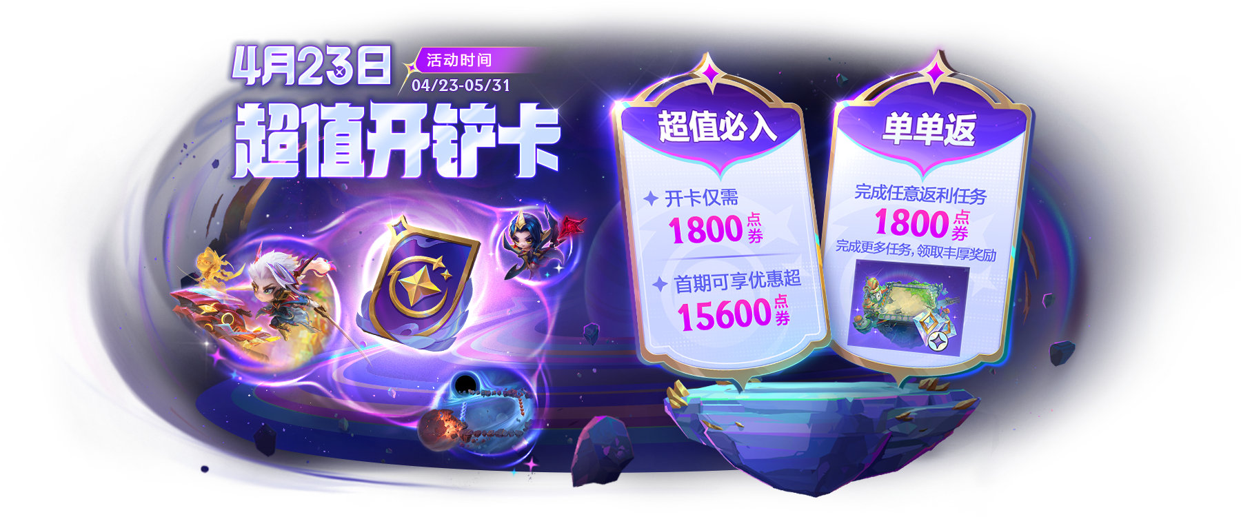 4月23日更新后-5月31日23:59,使用1800点券开通“超值开铲卡”,完成任意返利任务即可获得全额开卡点券返还,更有全新传说级竞技场“天空之镇”、开铲季棱彩兑换石等丰富奖励等待弈士们解锁。
