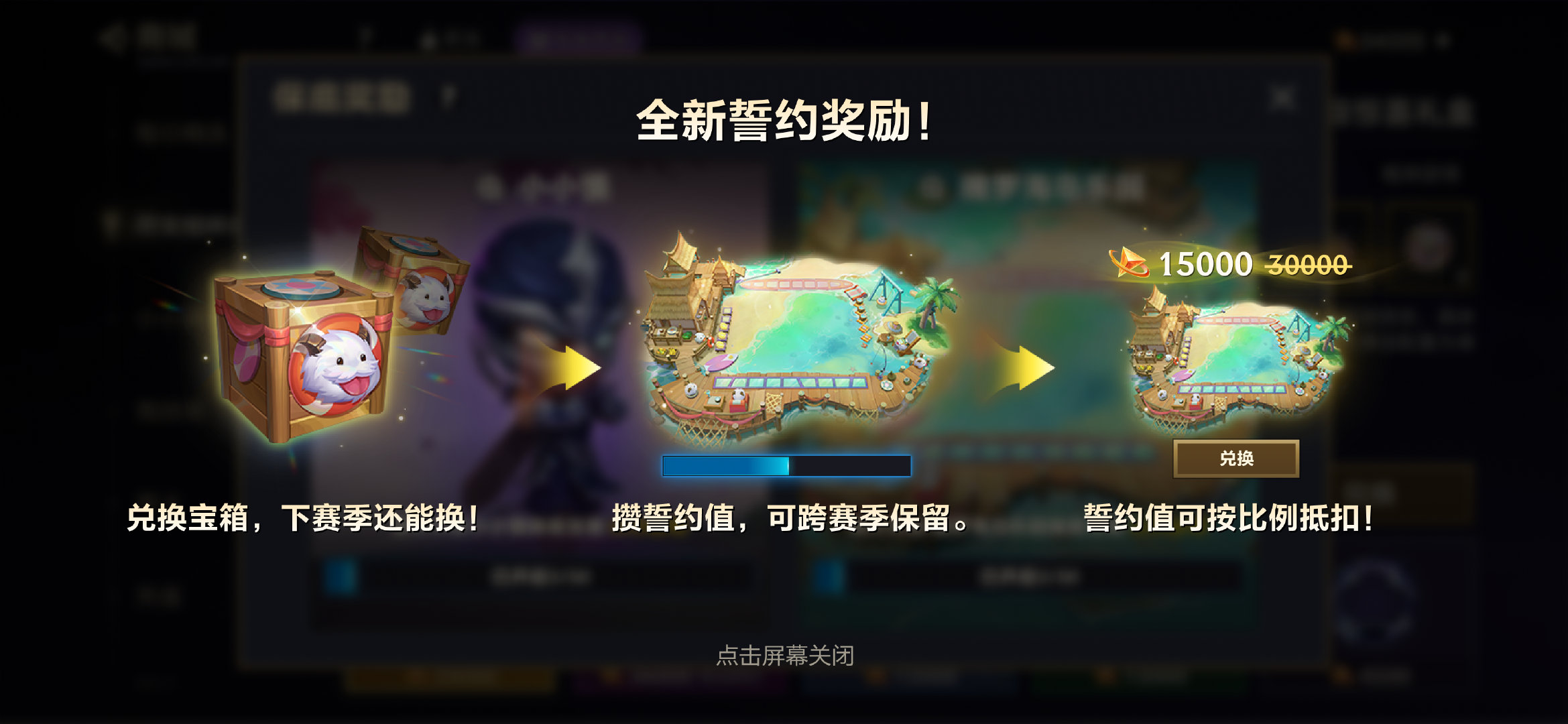 ● 全新“誓约奖励”机制:商店的刷新商品中会随机出现“誓约宝箱”,通过兑换增加对应道具的专属誓约值,达到一定的誓约值可直接解锁,也可以将积攒的誓约值进度转化为兑换折扣。誓约值跨赛季保留,不会因赛季更新而清除。