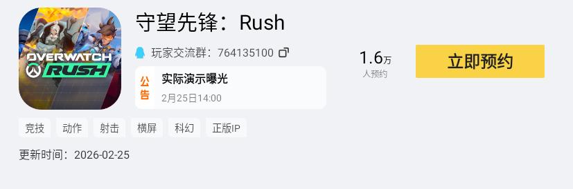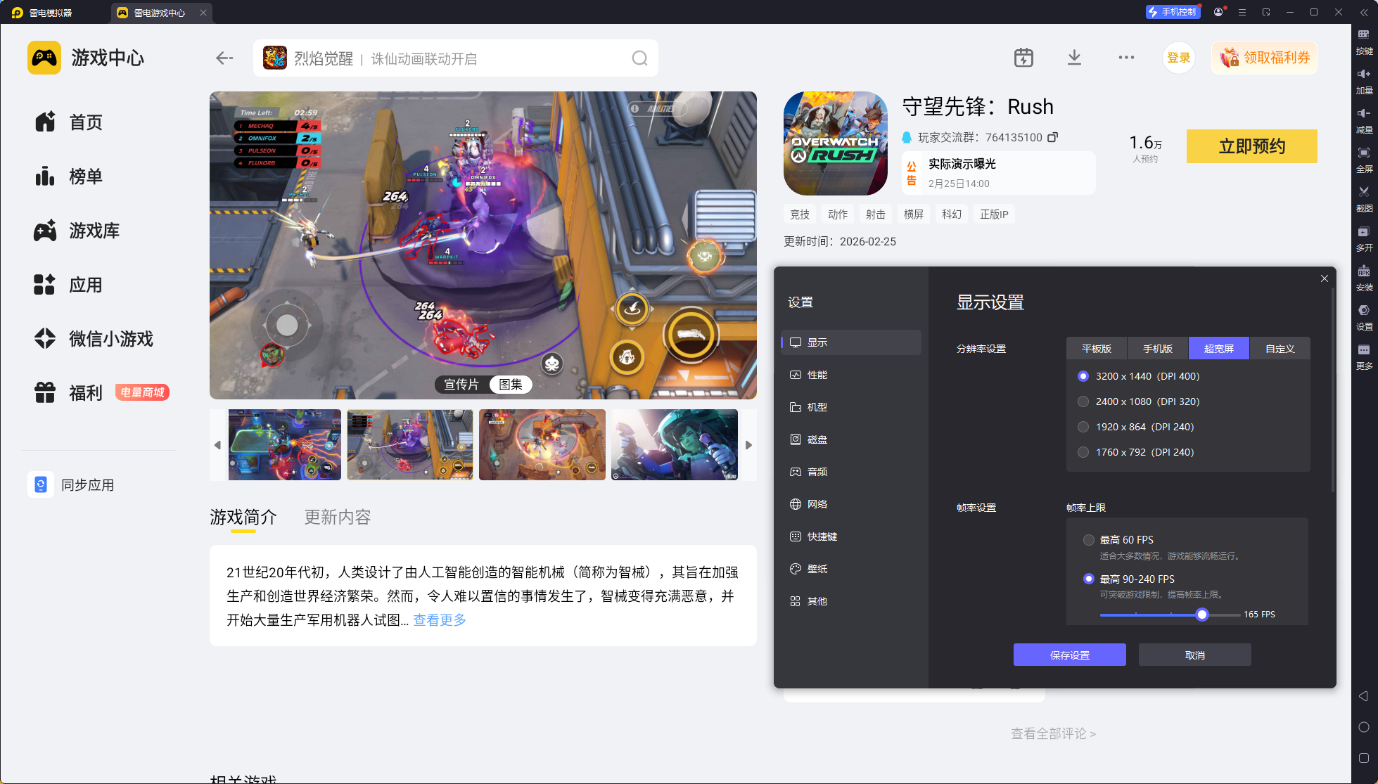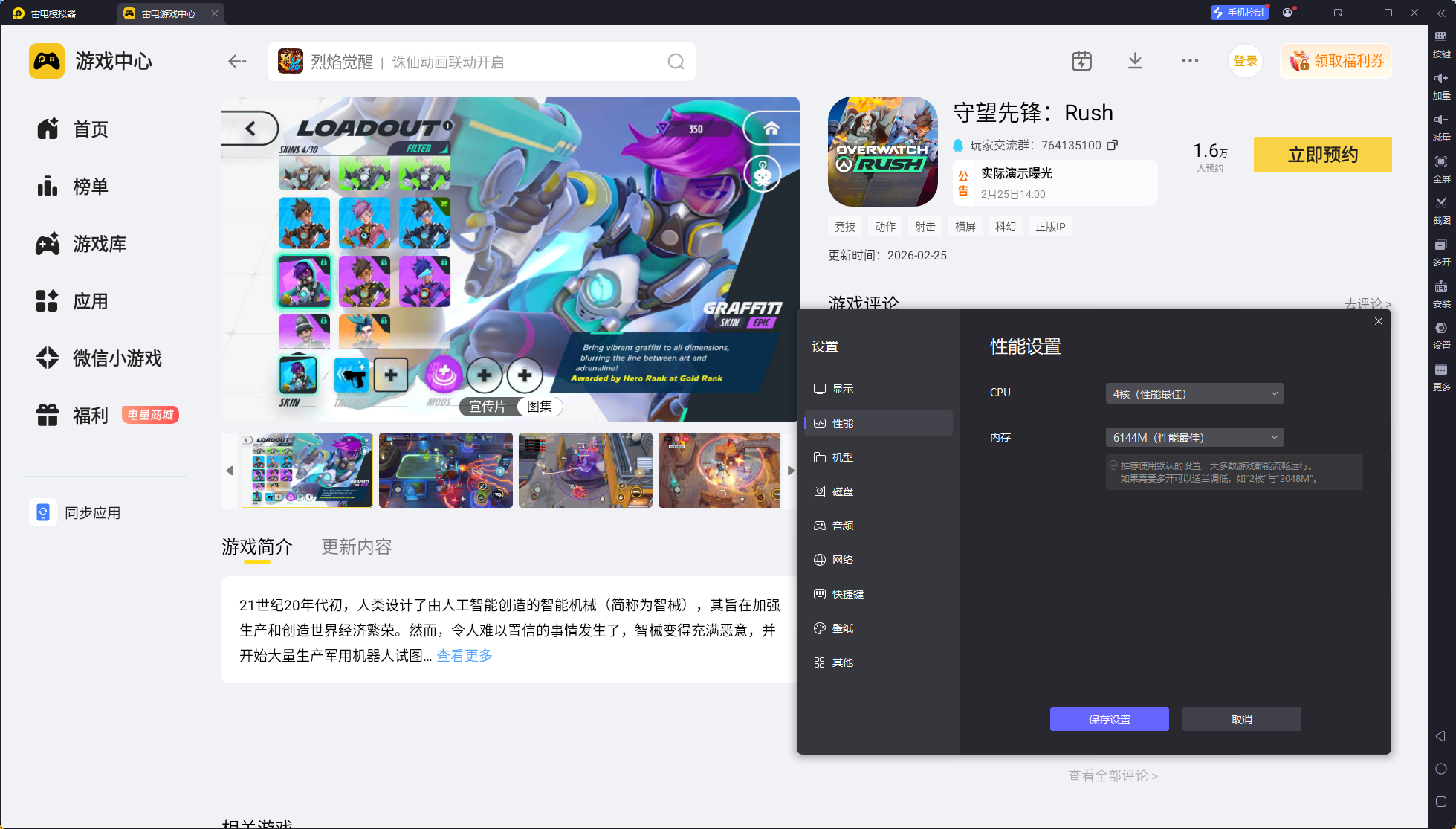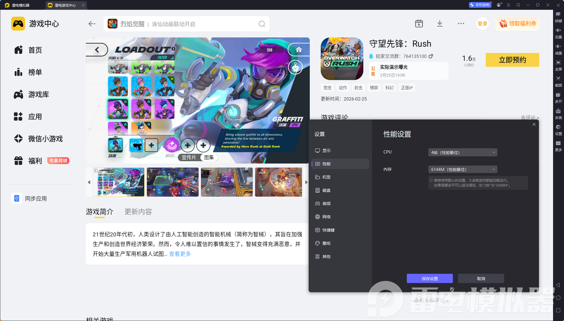 安装完成后打开雷电模拟器,进入内置的雷电游戏中心,在搜索栏输入守望先锋Rush,点击立即预约,游戏上线后就能第一时间体验。