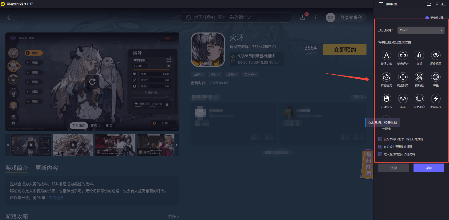 雷电模拟器支持玩家完全自定义键鼠,帮助玩家简化操作流程,更加流畅地释放优赛尔的超级小连招,助你轻松推关。