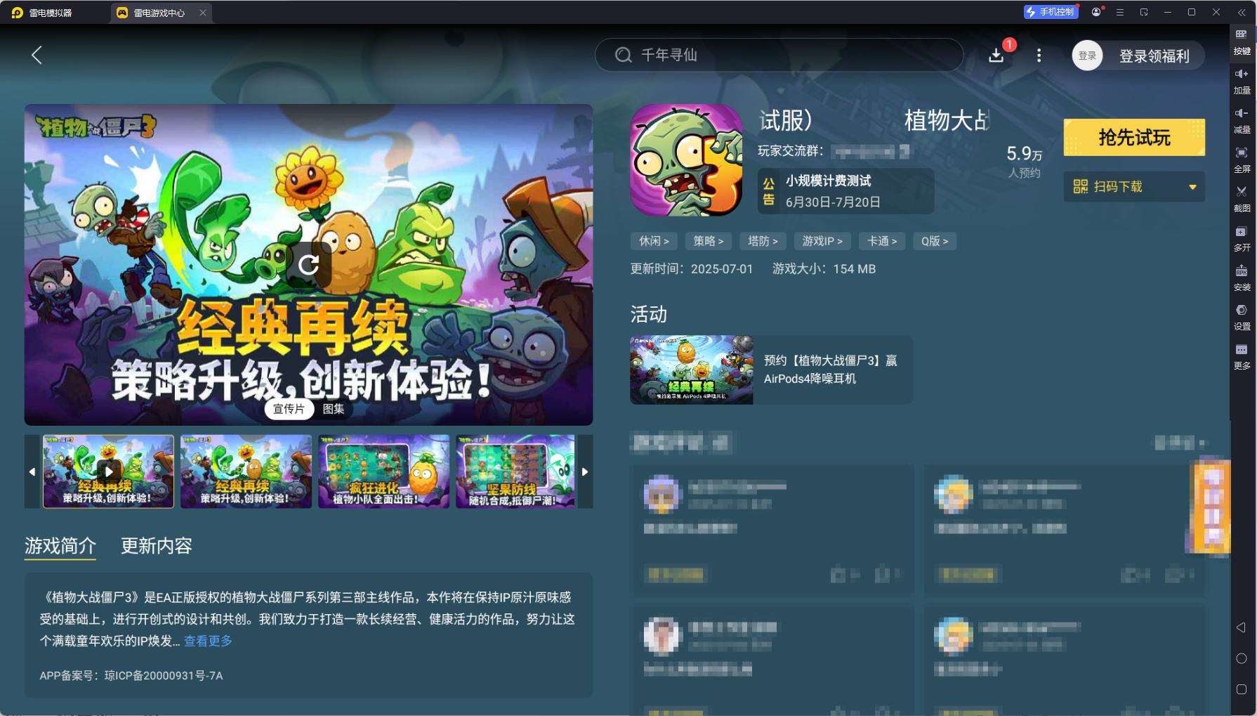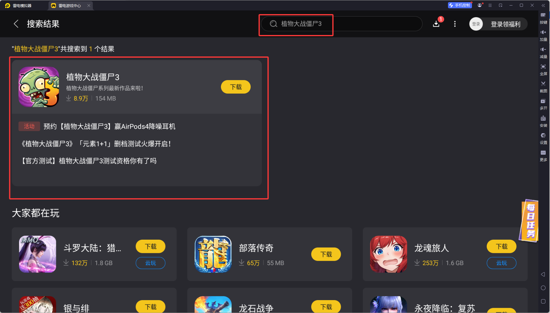 安装完成后,启动雷电模拟器,进入内置的“雷电游戏中心”。在搜索栏输入“植物大战僵尸3”,点击下载即可,无需进行多余操作。