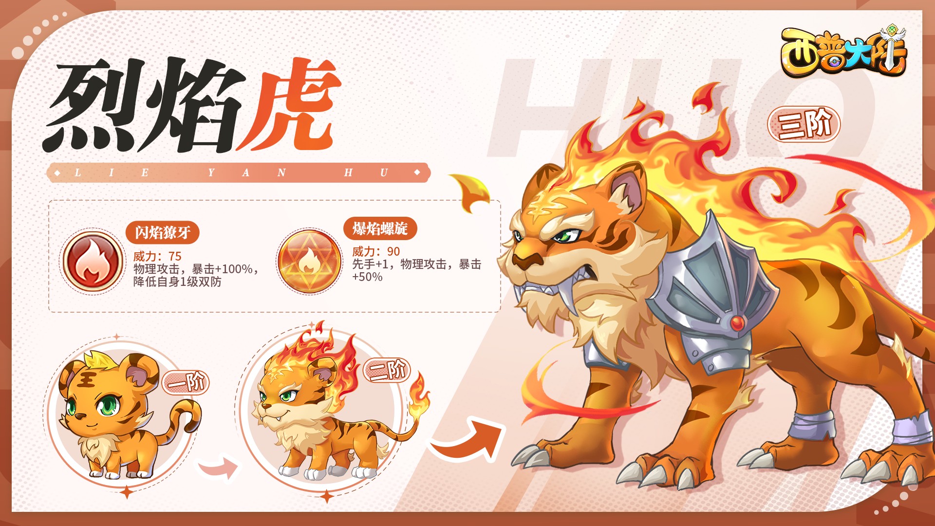 乖乖虎长着一副可爱讨喜的模样,实际上却是西普大陆精灵界知名的小淘气,经常因为太过活泼闹出不少小问题,但又因为乖巧的长相被原谅。热情且不怕生的它对万物充满了好奇,什么都要摸一摸碰一碰。长大了一点后,火焰元素亲和力极强的它身上也已经冒出了火焰,渴望变得强大的它,一次又一次地挑战强敌,遇到实力相当的对手能战上数百回合也不会感到疲倦,直至火焰遍布全身,强大的它为自己配上了盔甲,以便应对更加艰难的挑战。