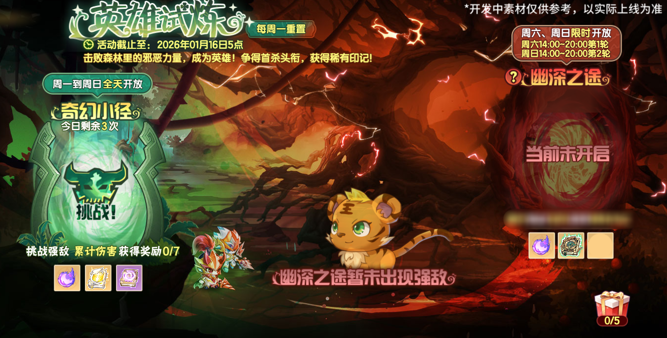 击败森林里的邪恶力量,成为英雄!活动共开放四周,每周五5:00将重置所有挑战进度和奖励。每周一到周日会全天开放奇幻小径挑战,每日可挑战3次,小西普们可根据累计伤害领取进度奖励。每周六、周日会分别开启幽深之途第1轮和第2轮的挑战:第1轮挑战前100名玩家可参与第2轮挑战。