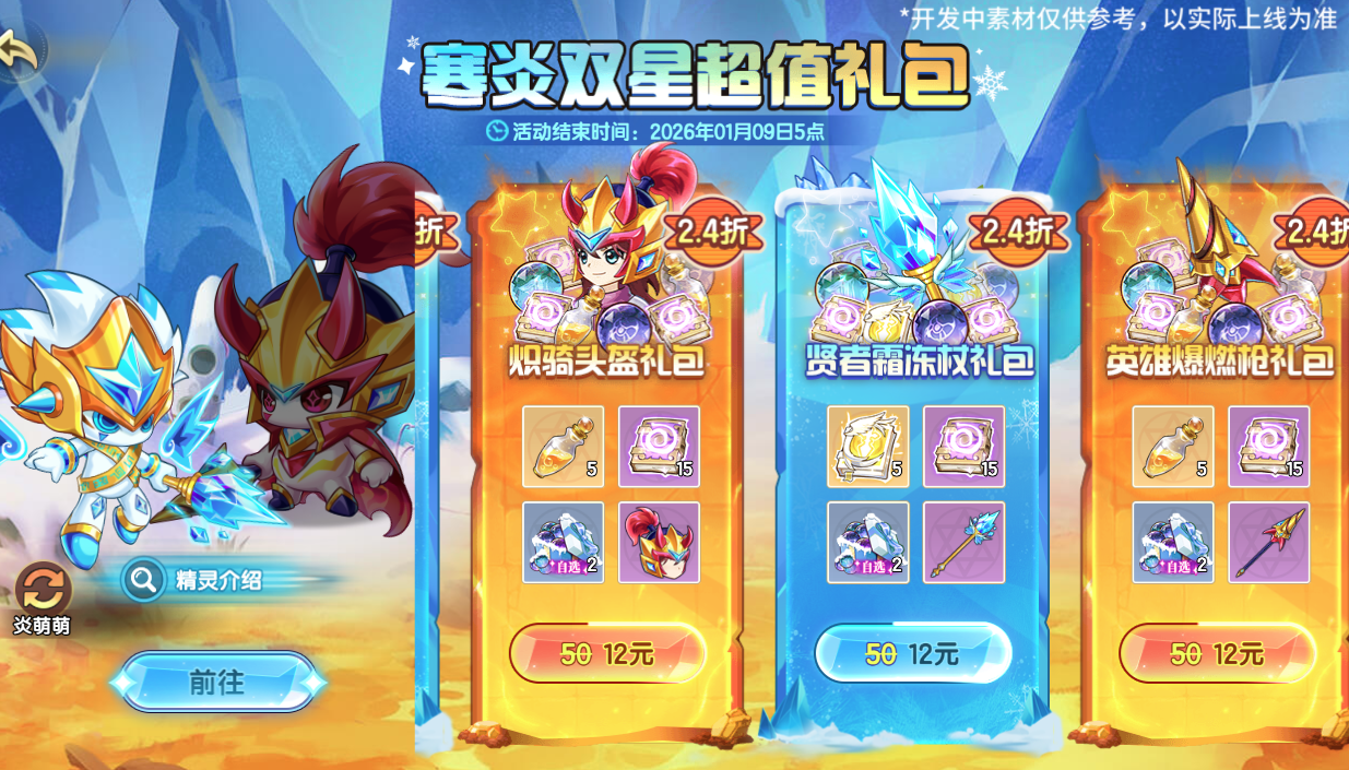 寒炎双星来袭,也给小西普们带来了双星装扮礼包——炽骑头盔礼包(装扮)、英雄爆燃枪礼包(装扮)、霜魄法冠礼包(装扮)、贤者霜冻杖礼包(装扮)以及资源养成礼包(内含灵源、天启能量等)。