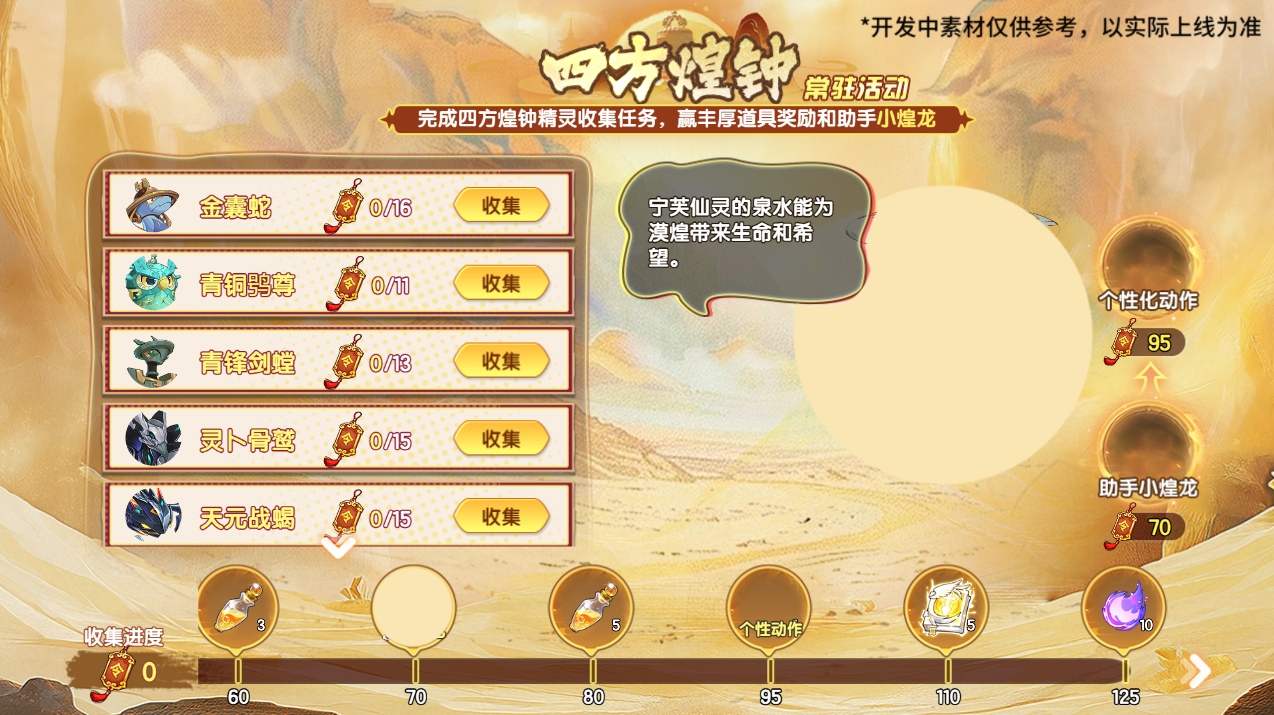 四方归漠篇章已步入尾声,完成相应的精灵收集任务,可领取培养道具以及跟随宠·小煌龙。