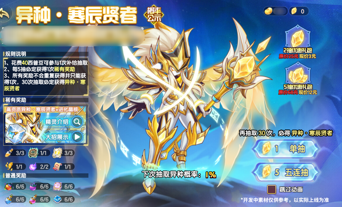 花费西普豆可参与一次补给抽取,每次抽取将有机会获得大型经验果、蓝之星纹、紫色星魂秘药等普通奖励,或异种精灵·寒果果及进化晶核、资质药水、同源置换卷轴等稀有奖励,抽取5次必定获得1次稀有奖励。除此之外,还为小西普们准备了超值2抽以及5抽优惠礼包!此次异种精灵·寒辰贤者的专属绝招特效也将同步上线。