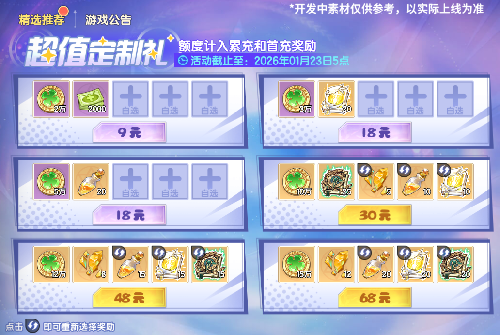 活动期间将推出多档自选礼包,不同档位的礼包可选择的奖励不同。小西普们可选择封灵碎片、恒守神谕、资质药水、天启能量等珍稀奖励。