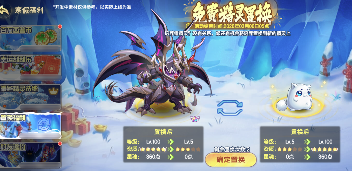 活动期间内,小西普们有2次可以将已经培养的精灵与希望养成的精灵进行置换的机会。可置换两只精灵的等级、星魂、资质、专属潜能,并退还培养普通潜能所消耗的培养材料。