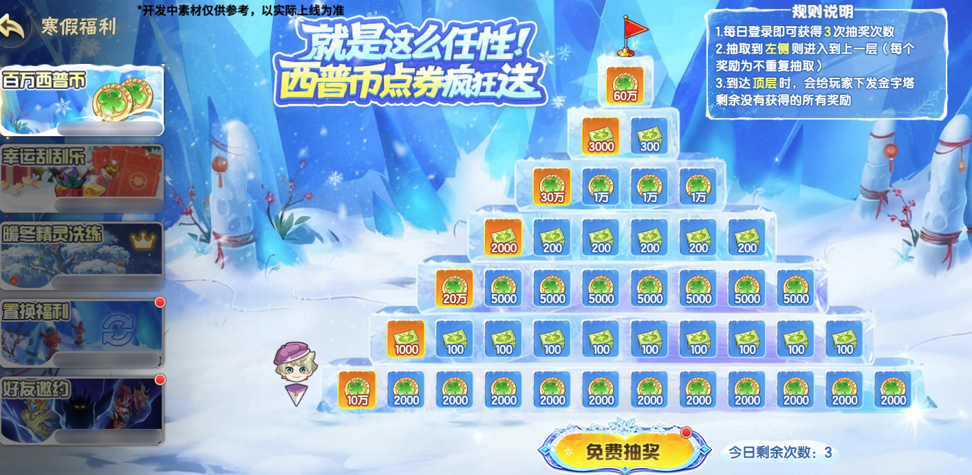 每日登录可获得3次抽奖次数,抽取到金字塔当前层数大奖(橙色奖励)则进入到上一层(每个奖励将不会重复抽取)。到达顶层后,将获得金字塔内没有抽取到的所有奖励。