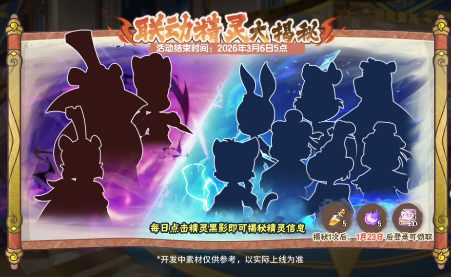 活动期间内,每日可揭秘两位联动精灵。点击揭晓任意一只精灵,在1月23日版本更新后,登录游戏即可领取相应的奖励。