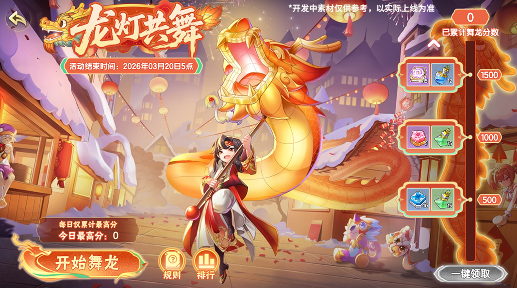 元宵佳节,舞龙表演开始啦,累计表演分数达到指定目标,即可领取奖励,历史单次最高分记录将计入在排行榜,快来一展身手吧!