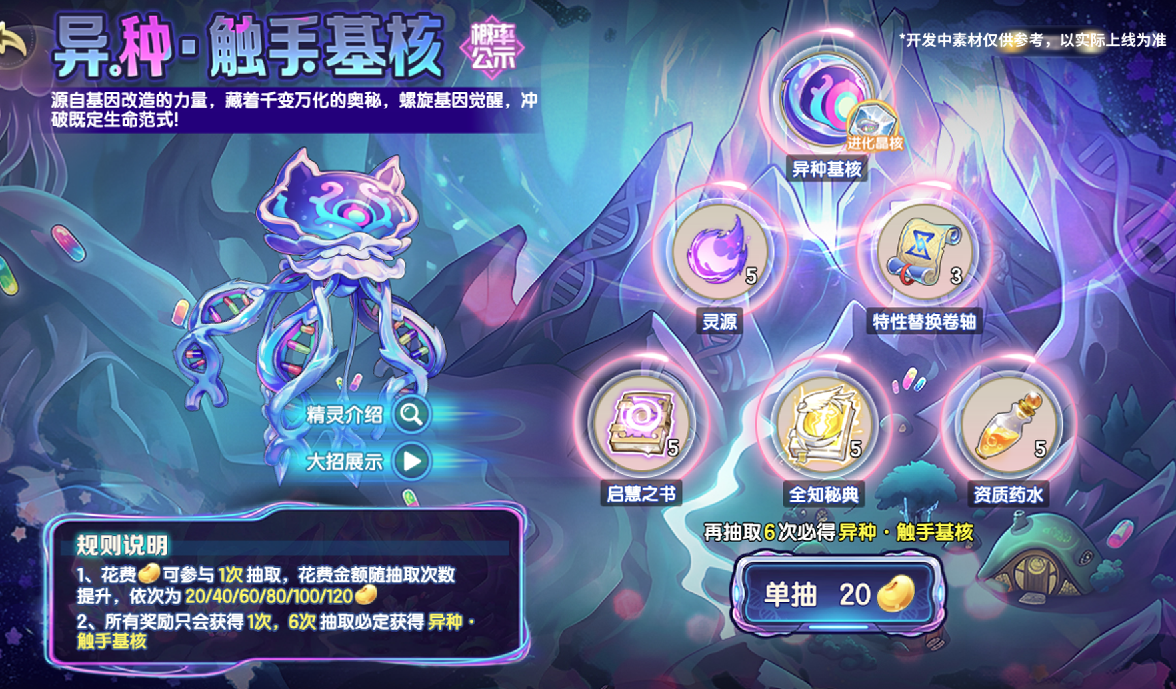 花费西普豆可参与一次抽取,每抽取一次所花费西普豆的金额将随抽取次数提升。每次抽取将有机会获得异种精灵·基核(一阶)、资质药水、全知秘典等奖励,所有奖励只有一次获取机会,6次抽取必定获得异种精灵·基核(一阶)。