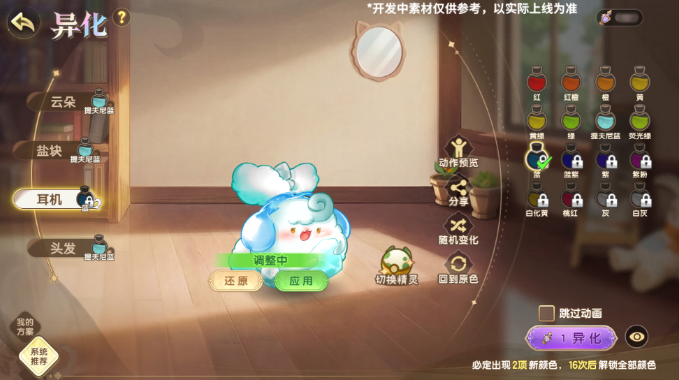 异化系统上线后,每只可异化的精灵将有4个部位可进行异化,以精灵·盐朵朵为例,可云朵、盐块、头饰、以及头发进行异化(不同精灵的可异化部位将根据其外观结构有所差异)。