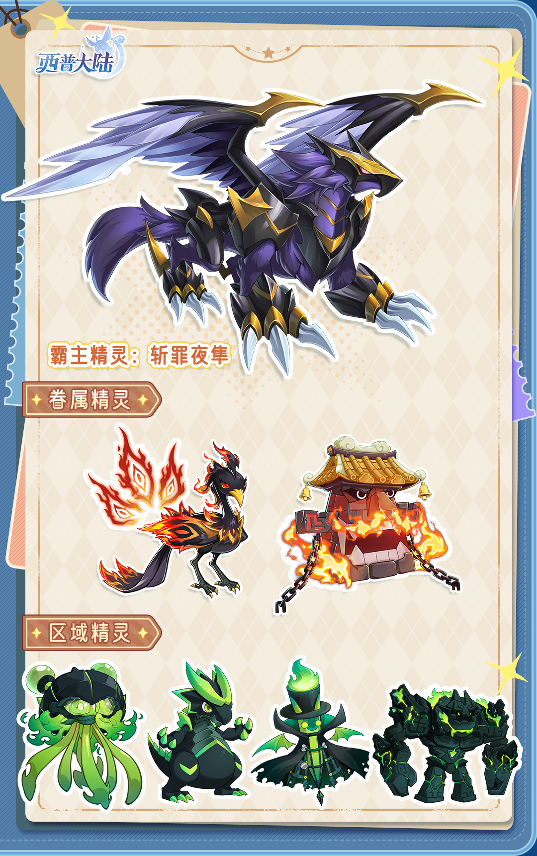 精灵奖励:罚罪夜隼、幽影七目雀、炎狱普卡、区域限定异化(岩浆水母、赤炎果龙、烛火伯爵、爆石巨像)