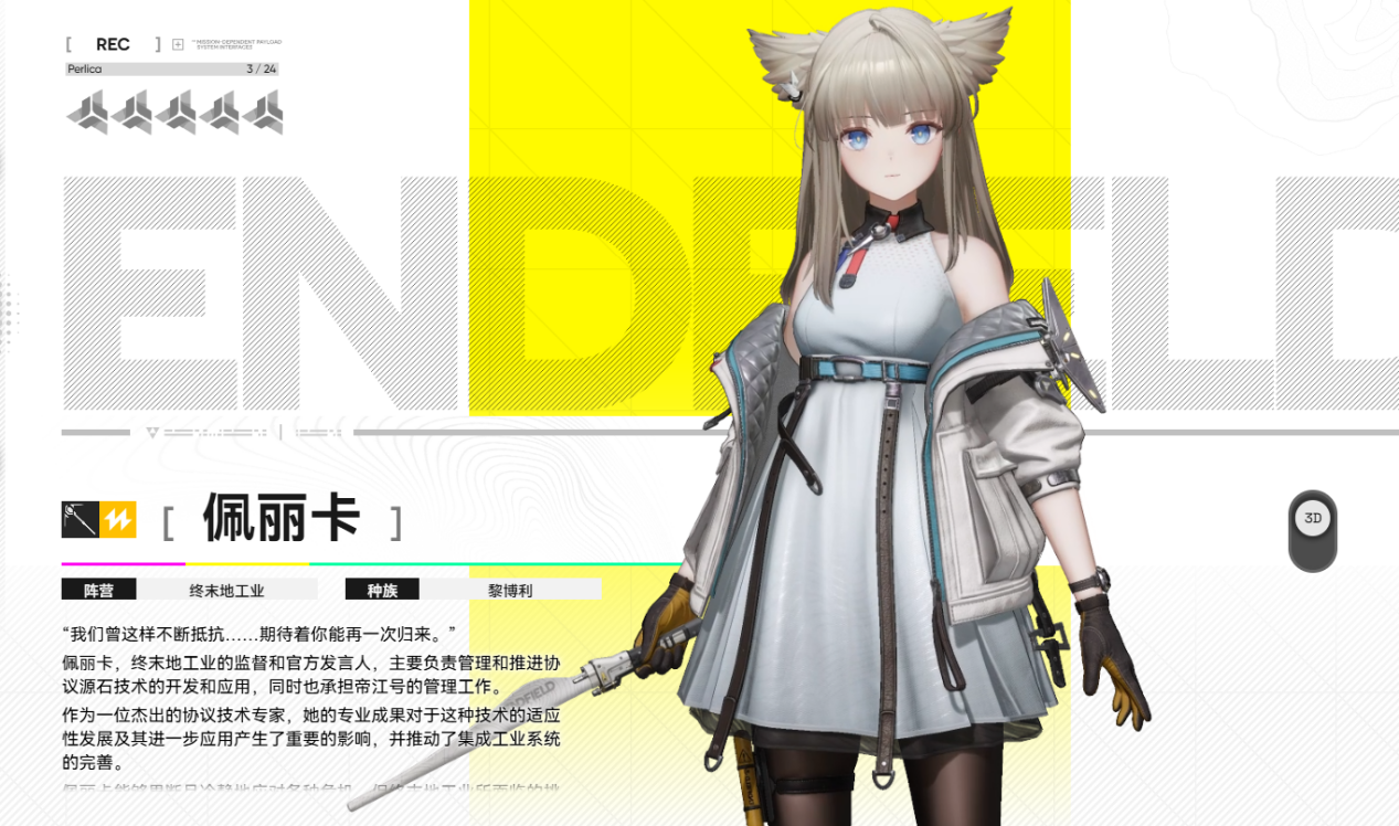 佩丽卡是《明日方舟:终末地》的核心剧情主角,属于菲林种族,有着辨识度极高的蓝色眼睛,手持长剑作为武器,是一名实力超群的六星近战干员。她既是终末地的官方发言人,又能在战斗中发挥强大实力,主动技能可对敌人造成高额脉冲伤害,终结技能还能轰击一片区域的敌人,是推动主线剧情的关键人物,几乎每个剧情节点都离不开她。