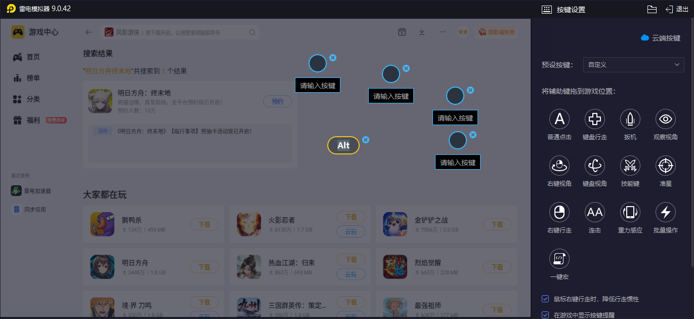 如果大家在日常的游戏体验阶段,对于其中的一些技能组合等比较的在意,希望自己可以做到快速释放,那么雷电模拟器带来的按键自定义功能也是不容忽视的,不仅可以去根据自身的需要来设定不同键位,可以可以去借助一键宏功能,来设定技能组合,让自身实现快速且有效的战斗打击表现。
