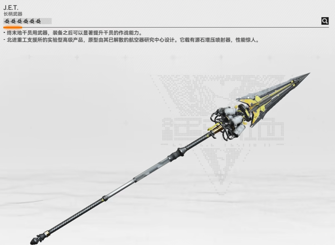 J.E.T:基础攻速比同类长柄武器快10%,近中程攻击距离有优势,普攻命中率高且无明显空窗期。适合需要灵活拉扯的战斗场景,干员可在安全距离稳定输出,生存与输出兼顾。