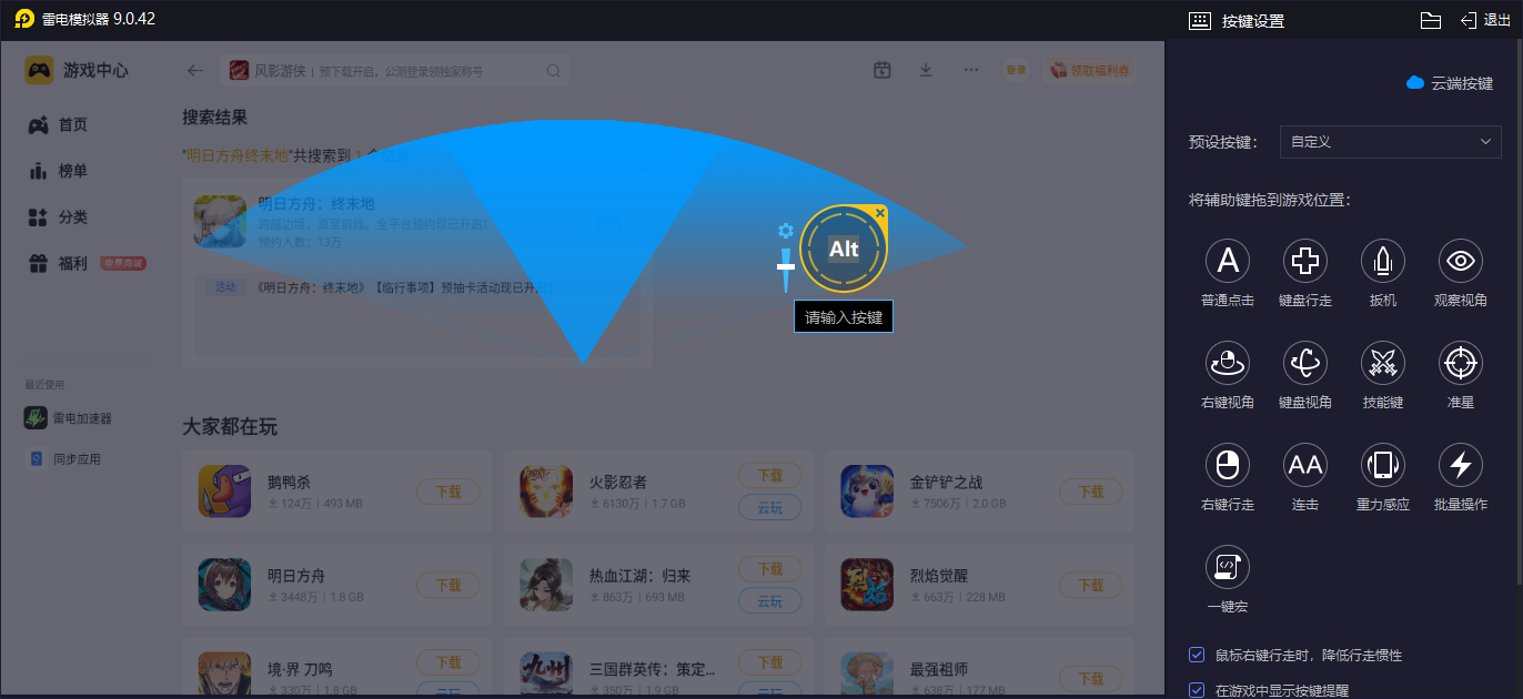 想要让自身在与敌人对决,或者是战斗期间可以不用担心有触屏失误的问题,可以直接使用雷电模拟器的按键自定义来帮自己,不仅足够的便利,同时使用起来也是更加的精准,玩家可以去主动选择不同的键位设定,而且还有组合按键与一键宏功能,让我们的一些连招使用,可以边的更加便捷与快速哦,而这点也是目前很多软件所无法比拟的。