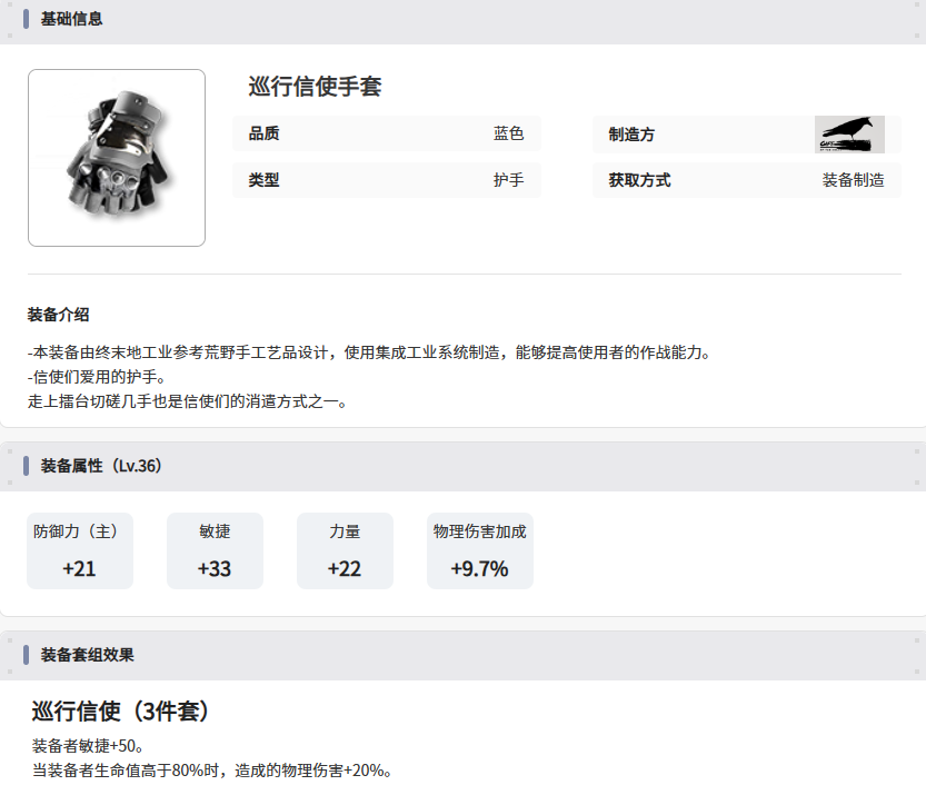 进入游戏中期,副本难度提升,对输出节奏和爆发能力提出了更高要求。这时,巡行信使套装成为理想的过渡选择。该套装在属性上进行了强化:护甲提供更高的战技伤害加成,护手直接增加攻击力,而两个配件槽则能大幅提升终结技的爆发力。其套装效果尤为关键:首先增加50点敏捷,优化了攻击速度和技能释放的流畅度;其次,当管理员生命值保持在80%以上时,能获得高达20%的物理伤害加成。这套装备要求玩家具备一定的操作技巧或配合治疗/护盾手段来维持高血量线,非常适合应对中期BOSS战和高难关卡,尤其契合偏好闪避和精准血量控制的玩家,能打出可观的爆发伤害。