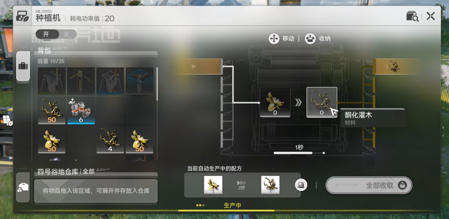 仅靠野外采集效率较低,返回基地后可搭建量产产线实现无限供应。先解锁基础AIC等级2获取种植技术,再部署1台采种机和2台种植机,用管线将它们连接起来:把1株酮化植物放入采种机,会产出2颗酮化树种;将树种投入种植机,可培育出2株酮化植物,其中1株回流到采种机循环,另1株作为产出储存,形成稳定闭环。也可在源石科学园的生态农场种植酮化灌木田块,12小时后即可收获大量酮化植物。