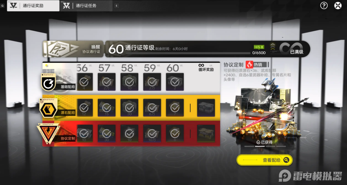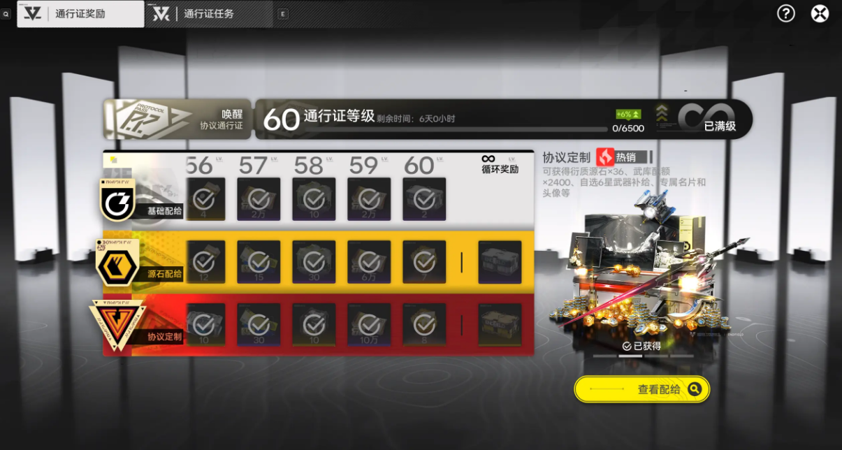 基础配给:这个是所有玩家都默认解锁的,没有额外的消耗,奖励数量上也十分的有限,好在可以满足新手前期的一些基础需求,是广大零氪玩家的唯一选择,通过完成每日、每周任务提升通行证等级,可获得基础养成材料,如经验书、货币等都是起哈总之一,而且还有少量抽卡资源奖励。