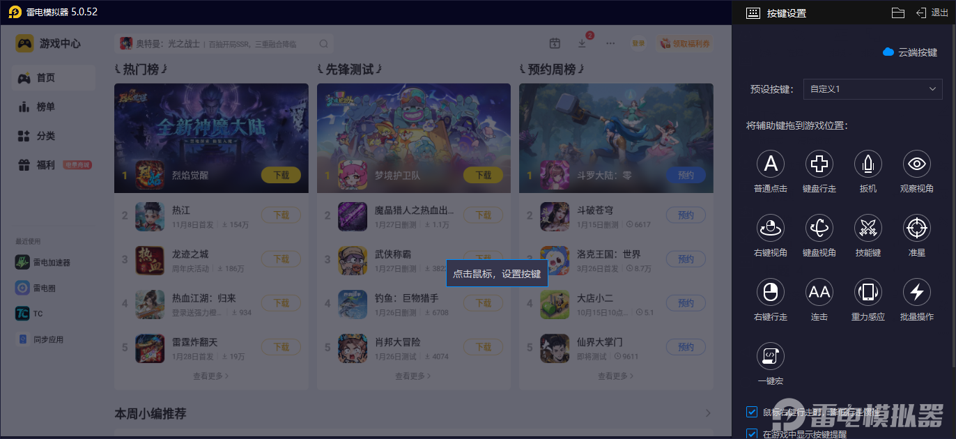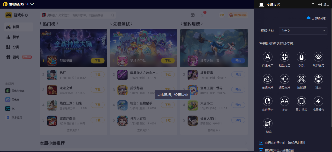 为了能让玩家到时候的游戏效果更好,其实雷电模拟器也是带来了很多实用功能的,比如大家可以去针对不同角色的技能等方面来进行键位的设定,根据自身的操作习惯,移动、跳跃、释放技能等都是可以去快速绑定物理按键的,这样一来大家也就不用再担心会有操作上的失误问题,且打击的效率更加的精准化哦。