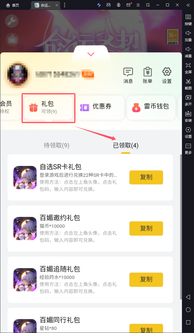 3、选择【礼包】-【已领取】,即可找到预抽卡中奖的礼包码
