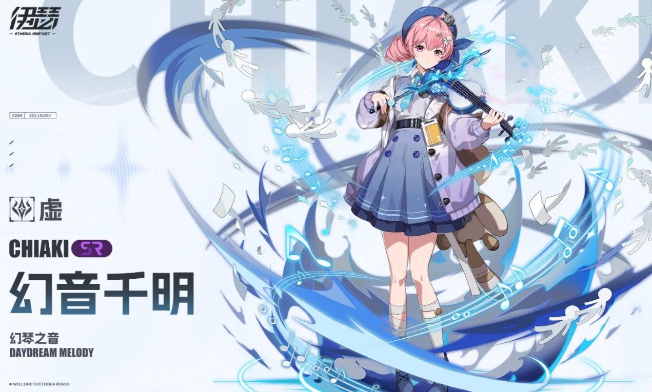 与幻念千明不同的是,幻琴之音千明整体的外观以及技能特效都是蓝色的,定位偏向于战术型辅助,为队友在关键时刻提供增益,提升整体队伍的实力。其普攻音涌会向敌人发射一道无形的音波攻击,对单体敌人造成240%的伤害,有60%的概率为减益效果最多的队友减少一个效果。