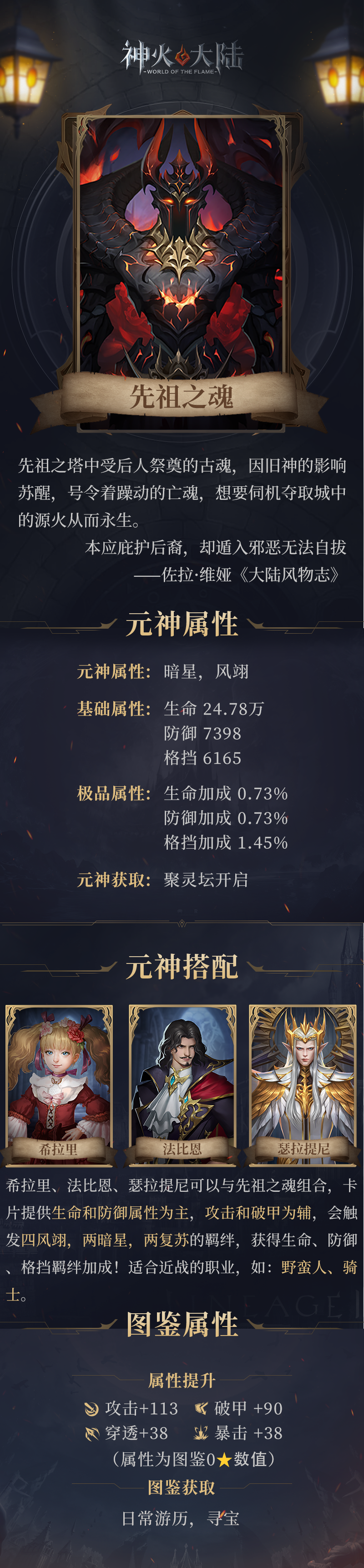 各位无眠者,大家晚上好呀!小佐拉继续带大家了解元神玩法的人物背后故事,属性以及各个元神之间的搭配推荐,本次搭配适合职业:野蛮人、骑士快收下这个礼包码:JI5YNH,一起来看看今日先祖之魂的背景故事,属性,元神搭配吧!文末还有元神卡牌抽奖活动,赶紧看过来吧!