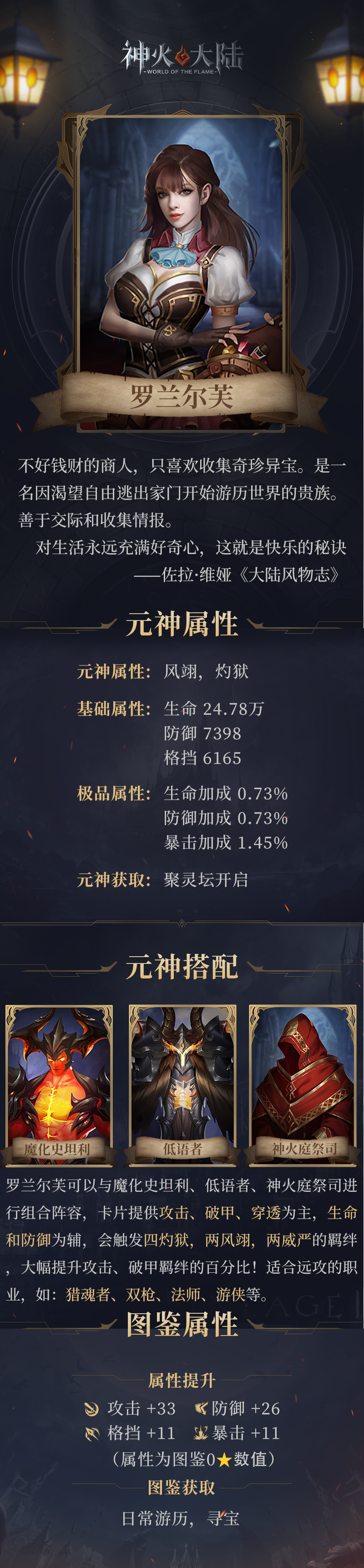 各位无眠者,大家晚上好呀!小佐拉继续带大家了解元神玩法的人物背后故事,属性以及各个元神之间的搭配推荐,本次搭配适合职业:猎魂者、双枪、法师、游侠快收下这个礼包码:T9V7NU,一起来看看今日罗兰尔芙的背景故事,属性,元神搭配吧!