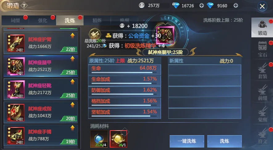 完成一个部位装备进阶后,可以拆解打造下一个部位,继续洗练,这样可以省很多装备洗练精华!